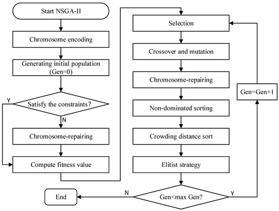 The optimization model can be expressed as a nonlinear mixed integer programming model. The configuration optimization model mentioned above is a combinational optimization problem and, thus, is an NP-hard problem. The meta-heuristic algorithm is more effective than traditional algorithms in solving such problems [10]. In addition, since the solution space of the proposed model rapidly expands when the number of RCS and suppliers increases, we eventually considered using the metaheuristic algorithm, NSGA-II, to achieve a near-optimal solution for the optimization problem. NSGA-II could deal with high-dimensional and more difficult multi-objective optimization problems, which is suitable for product family design problems [27,39]. NSGA-II, as the second generation of a multi-objective evolutionary algorithm, uses a fast non-dominated sorting mechanism, an elite protection strategy, and crowding distance to solve the Pareto frontier solution of multi-objective optimization [40]. The flow of the proposed algorithm is shown in Figure 2 and is briefly described below.