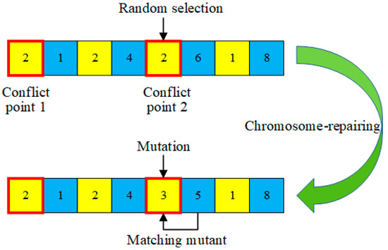 As described in Section 3.2, there were some constraints in the product configuration problem. We mapped these constraints to the gene sequence of the chromosome. Chromosomes should be repaired when there is a conflict between genes. The gene sequence of each chromosome can be detected during the generation of the initial chromosome population. If the chromosome gene does not satisfy the constraint conditions, the repair method is as follows. The first step is to identify and mark the conflicting gene point indexes. Then, the sequence indexes of conflicting gene points are randomly selected, and the index is randomly mutated, as shown in Figure 4. Finally, the repaired chromosomes can be detected again. If the constraint conditions are still not satisfied, the repair method mentioned above is repeated until the chromosome gene sequence satisfying the constraint is obtained. The chromosome-repairing method also applies to chromosome crossover and variation.