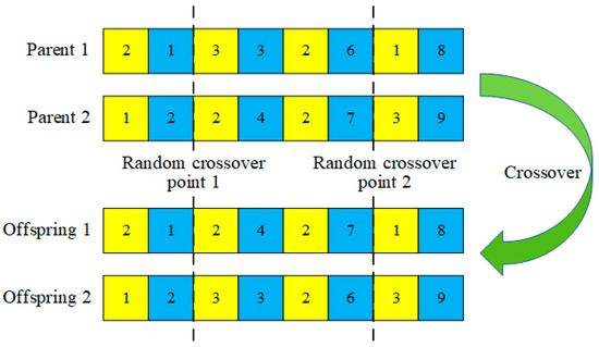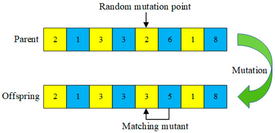 Crossovers and mutations are genetic manipulations that mainly affect evolution. In this study, a two-point crossover and a single-point mutation were used. In Figure 5, two crossover points were randomly selected for chromosome crossing. Offspring 1 and offspring 2 were generated by exchanging genes between the crossing points of parent 1 and parent 2. The generated offspring chromosomes were new configuration schemes. The single-point mutation is shown in Figure 6. A mutation point was randomly selected, and the gene at the selected point was mutated to generate new chromosomes. To ensure that the module instance and supplier corresponding to the mutation point matched each other, both of them needed to be re-selected. It should be noted that the chromosome gene sequence needed to be detected when the crossover and mutation were completed. If the chromosome gene sequence did not satisfy the constraint conditions, the method mentioned in Section 4.2 was used to repair the chromosome.
