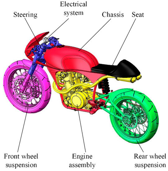 This section uses a motorcycle case to illustrate the proposed approach. The motorcycle had been designed as a modular structure consisting of seven RCS, including steering (RCS1), front wheel suspension (RCS2), rear-wheel suspension (RCS3), electrical system (RCS4), engine assembly (RCS5), seat (RCS6) and chassis (RCS7), as shown in Figure 7. Each RCS contained a set of module instances with similar functionality that could satisfy a variety of customer needs. The module instances number of RCSs was 4, 5, 5, 3, 3, 5, and 3, and the corresponding number of product variants was 13,500 (4 × 5 × 5 × 3 × 3 × 5 × 3). It was assumed that each module instance was provided by only one supplier, and different module instances of the same supplier were transported in the same way. In order to avoid involving some commercially sensitive data, data masking was carried out in this study. Table 2 and Table 3 show the supplier information and candidate module instance information, respectively.