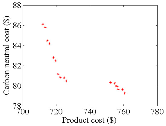 The NSGA-II algorithm was used to construct the product cost and carbon-neutral cost bi-objective optimization model (PC-CNC). NSGA-II was coded in the programming language Matlab and was run on a desktop computer (8 GB RAM, 3.60 GHz CPU using Windows 10). The population size of NSGA-II was set to 100, and the number of iterations was 100. The crossover rate and mutation rate were set to 0.9 and 0.1, respectively. Figure 8 shows the Pareto frontier after 10 repeated solutions. The first solution had the lowest product cost and the highest carbon-neutral cost. The 17th solution was the opposite, with the highest production cost and the lowest carbon-neutral cost. Through a comparison of 17 schemes, it was found that if the enterprise reduced the product cost, the carbon-neutral cost borne by the government would increase correspondingly.