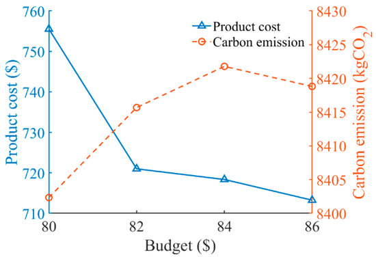 The optimal configuration results when the government’s carbon emissions control budget for the products was $80, $82, $84, and $86, respectively, are shown in Table 5. It could be seen that the product configuration with a relatively low cost but high carbon dioxide emissions tended to be selected when the carbon emissions control budget was abundant ($86 or $84). On the other hand, when the carbon emissions control budget was low ($80 or $82), the product configuration with a relatively high cost but low carbon dioxide emissions were often selected. Carbon emissions fluctuate with the increase in the carbon-neutral cost, but the overall trend is upward, as shown in Figure 9. This shows that the carbon-neutral cost model fully considers the carbon emissions in product configuration and can effectively help designers to develop a low-carbon product family.