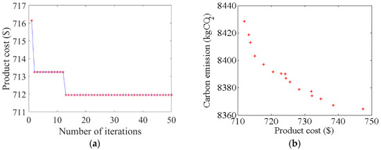 According to Equations (5)–(10), the total cost of a single product could be expressed as follows. Controlling the product cost enabled enterprises to pursue more profits and market price advantages. Therefore, minimizing the product cost was regarded as one of the main optimization objectives.