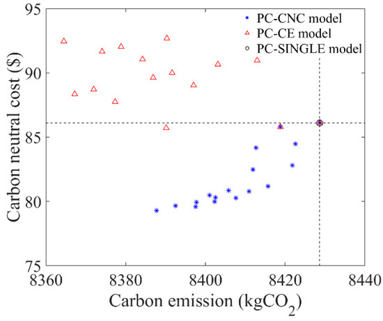 In order to confirm that the PC-CNC model was more suitable for the product configuration requirements under the background of carbon neutrality, two traditional optimization methods were compared: (1) the single objective optimization model considering only product cost (PC-SINGLE), and (2) the bi-objective optimization model considering product cost and carbon emissions (PC-CE). The calculation of the product cost and carbon emissions was based on the method provided in Section 3.4.1. The solving algorithms and parameters of PC-Single and PC-CE models are shown in Table 6. Figure 10a,b shows the optimal solution of the PC-SINGLE model and the Pareto frontier solution of the PC-CE model after 10 repeated solutions, respectively. As a single objective optimization model, PC-SINGLE had only one product cost-optimal solution, which was 711.96$. The PC-CE model and PC-CNC model had almost the same product cost (710$–760$) for the enterprise.