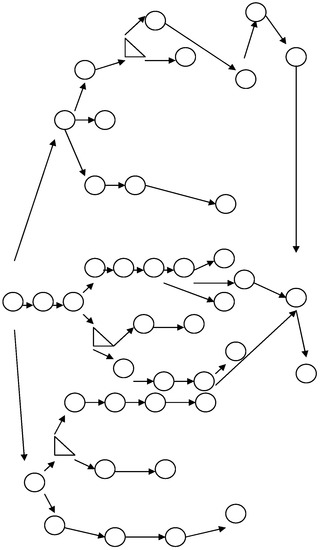 The comprehensive targeted program for organizing zero-waste production and solving the problem of industrial and household waste for a specific territory consists of program activities having alternatives and those lacking alternatives. A program event without alternatives can be performed in only one way, while a program event with alternatives can be performed in various ways. In Figure 2, a program event without alternatives is indicated with a circle, while a program event with alternatives is indicated by a triangle.