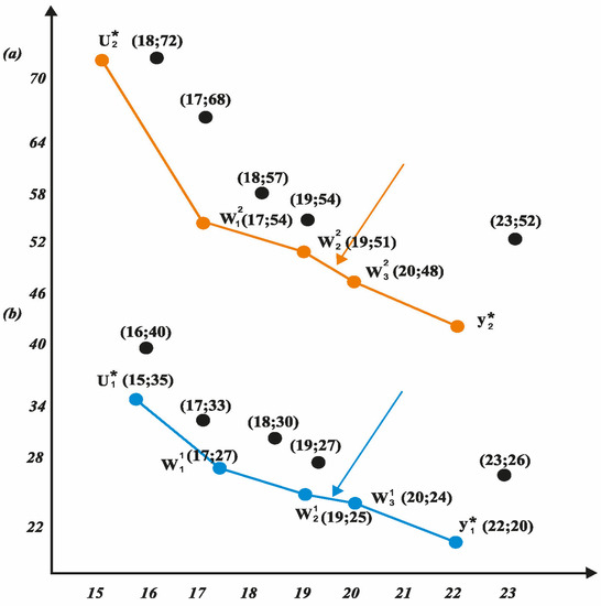 Figure 9 shows the set of effective options, including five options of the second higher scientific and technical level, which is highlighted in yellow, while the set of effective options with seven options of the first scientific and technical level is highlighted in blue. The set of ineffective options is not presented in the figure since, for each set of ineffective options, there is a better set of effective options. It is necessary to choose one of the options among the set of effective options, which includes the five options of the second higher scientific and technical level.