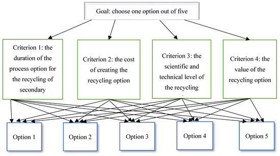 In our case, the goal within the analytic hierarchy process is formulated as “the choice of one option for the processing of secondary polymer raw materials from several options, each of which has different parameters”.