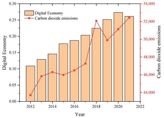 Time–series diagram of the digital economy and carbon emissions.