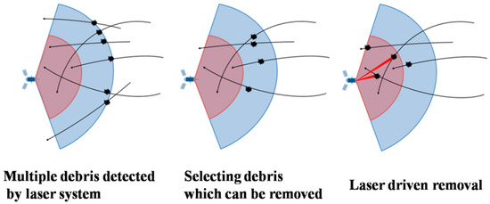 Due to the requirement of tracking accuracy, space-based laser platforms cannot perform laser irradiation under the guidance of other platforms. Even with the support of additional detection data, the laser ablation process still needs to rely on the platform’s own tracking and aiming equipment to detect and capture the target. When debris is detected, it is necessary to determine whether it will enter the platform’s range of action based on its trajectory, in order for the debris to be ablated. During the ablation process, the impulse determines whether the interaction can effectively lower the orbit or propel the debris away. The impulse direction generated by laser ablation is determined by the relative positions of the debris and laser platform. Debris that enters the scope of ablation has a limited time window, during which effective trajectory changes can be achieved through propulsion. The process is illustrated in Figure 1. When multiple debris enter the scope of action simultaneously or sequentially, challenges arise regarding the order of ablation and selection in the presence of time conflicts. This requires further optimization of the optimal action sequence based on their respective time windows and expected driving effects.