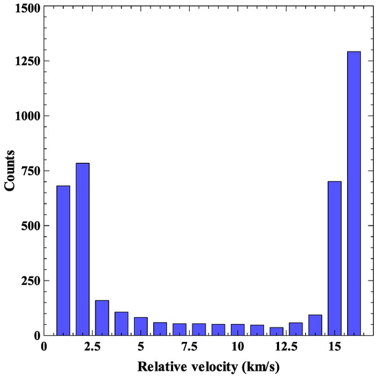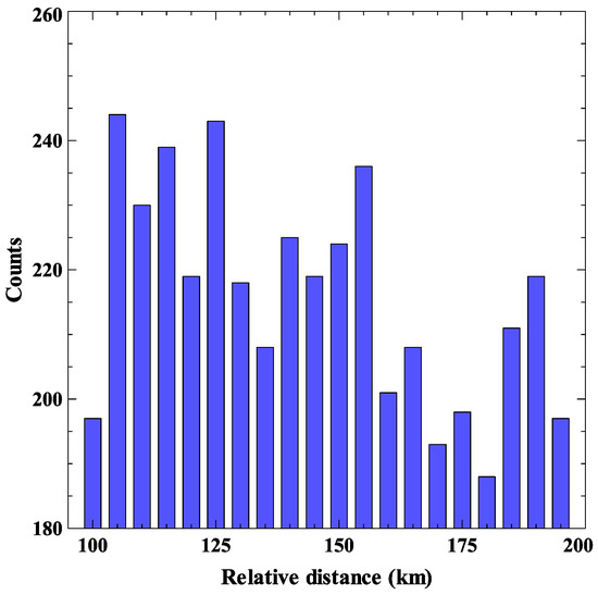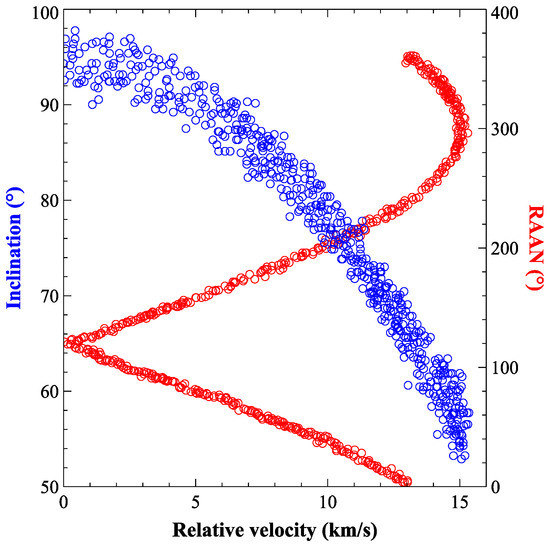 Taking the initial latitude angle of the laser platform u = 90°, the distribution of space debris is shown in Figure 11 and Figure 12. Similar to the previous example, in most cases, the relative speed is relatively high.