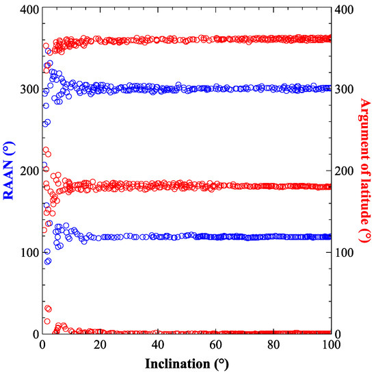 If the initial position of the laser platform is near the ascending/descending intersection point, Monte Carlo random sampling results in a probability of generating debris that meet the requirements of around 4%. If there is a chance of a close intersection for two space debris with different orbital inclinations, the time window of the leap is near to the ascending or descending intersection point. According to Formula (3), it is necessary to meet the following conditions in Equation (6) [27]: