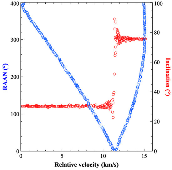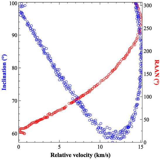 The results indicated that the intersection of space debris is approximately in the same orbit as the laser system. The orbital inclination and the right ascension of the ascending node are approximately the same. The relative speed is low and the window of time to meet the operating distance is long. Debris can be successfully cleared after a period of laser ablation, but the number of such debris is relatively small. Most of the debris and the laser system have different orbits, with a difference of about 180° in right ascension at the ascending node as shown in Figure 7 and Figure 8. This results in a relatively high relative velocity and a shorter window of time to meet the operating distance, making it difficult to clear.