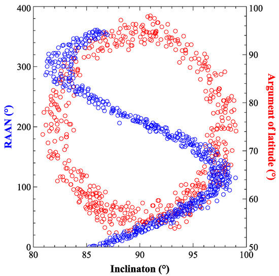 Distribution of declination/latitude argument and orbital inclination of ascending node.