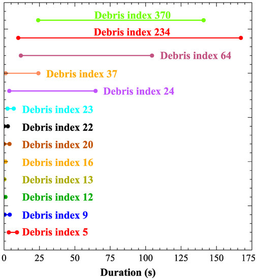 For debris with a descent window that cannot be cleared, the descent window is the on-off time corresponding to the maximum change in the height of the debris orbit. For debris that can be cleared, ACOR optimization is used to obtain the clearing window corresponding to the shortest ablation time. The output of some of the debris is shown in Table 2. Debris no. 64, 234, and 370 can be effectively removed when the perigee is less than 200 km. Most of the debris-driven windows have conflicts, as shown in Figure 13.