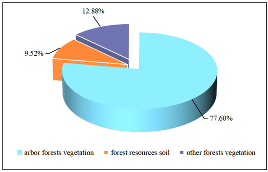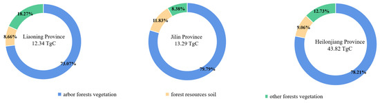 The full carbon sink of forest vegetation in the Three Northeastern Provinces is 69.45 TgC year−1. In 2019, this sink neutralized 22% of carbon emissions from energy consumption based on the statistical yearbook data [30,31,32] and carbon emission coefficient [33]. We divided the full carbon sink into three parts in this study: arbor forests vegetation, forest resource soil (arbor trees and special bushes), and other forest vegetation (sparse forest land, unclosed forest land, other shrubs, nursery, barren mountain shrubs, urban and rural green areas surrounding trees and scattered forests). The carbon sink of the different components are shown in Figure 2. The arbor forest vegetation contributed the largest carbon sequestration, accounting for 78% of the total. The Three Northeastern Provinces have a total area of 31.85 Mha of arbor forests, accounting for 77.78% of the total forest land area. Arbor forests in a forest ecosystem are mainly responsible for serving as a carbon sink. In other words, arbor forests are the key factor for determining regional carbon sequestration ability. Other forest vegetation absorbs CO2 through photosynthesis and fix it as biomass in plants during growth. The annual carbon sequestration of forest soil only accounts for 9% of the total, but it is a huge carbon pool, and fluctuations of the soil component will have a huge impact on climate change. For example, part of the organic carbon fixed in the soil will be decomposed and transformed by soil microorganisms and returned to the atmosphere in the form of CO2; the remaining will be converted into stable organic carbon after years of accumulation and stored in the soil [34].
