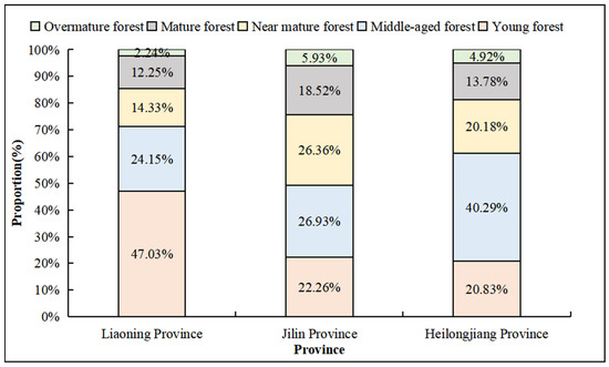 Proportion of different age groups of arbor forests in the Three Northeast Provinces.