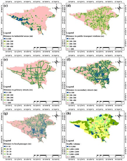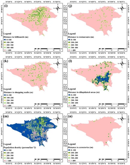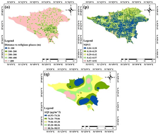 Spatial criteria affecting people’s visual perception: (a) Night light; (b) Distance to recreational attractions; (c) Distance to industrial areas; (d) Distance to public transport stations; (e) Distance to primary streets; (f) Distance to secondary streets; (g) Distance to local passages; (h) Traffic volume; (i) Distance to billboards; (j) Distance to restaurants; (k) Distance to shopping malls; (l) Distance to dilapidated areas; (m) population density; (n) Distance to cemeteries; (o) Distance to religious places; (p) NDVI; and (q) AQI.