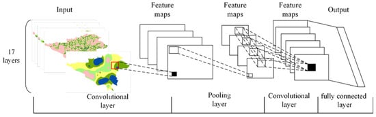 CNN is one of the primary methods of deep learning inspired by biological vision mechanisms []. CNN, one of the deep learning techniques, is mainly used for automatically identifying significant traits in studies (without human supervision) []. CNN is employed in numerous fields and sciences, like earth science, to classify and predict information; the primary function of this technique is to enter data in the form of photos and photo interpretations []. Entering data in images eliminates many parameters and accelerates the process []. Complex spatial features can easily be gathered through CNN and the convolution of multiple convolutional kernels (high capacity for extracting spatial features) []. The benefits of utilizing CNN are equivalent representations, sparse interactions, and parameter sharing []. CNN is a classification of deep learning neural nets and consists of one entry layer, one or a few convolutional, pooling, fully connected layers, and one output layer []. Figure 5 presents a CNN containing four layers.