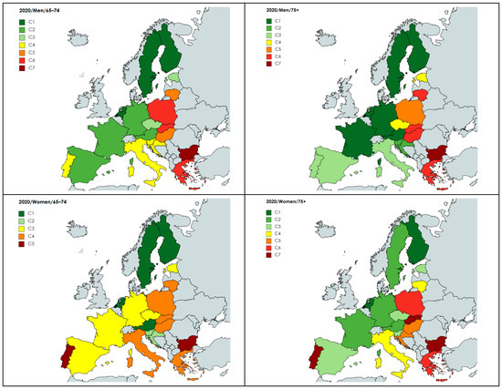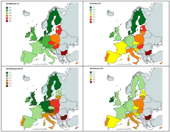 Four clusterings were made during both years (F65–74, F, 75+, M65–74, M75+). Clusterings compliance comparisons were made using the Rand coefficient [96,97].This way, similarities between classifications made in the same year were assessed. The Rand coefficient makes it possible to determine whether the assignments of countries to clusters are the same or similar. Still, it does not allow an assessment of the similarity of the obtained clusters’ characteristics. For this reason, it is crucial to provide detailed characteristics of the clusters.