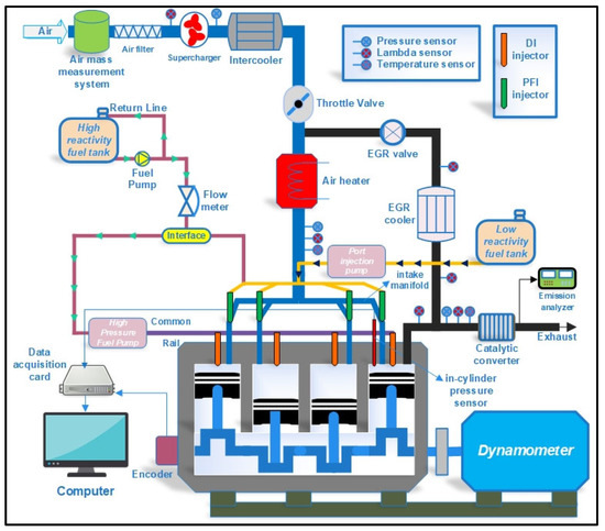 Control of the RCCI motor was achieved using MicroAutoBox, dSPACE and RapidPro. Control of throttle body, high-pressure fuel pump, variable valve timing and injectors was achieved using the MATLAB Simulink model, which is embedded in the processor. Parameters influencing engine control, such as pressure of fuel rail, ignition system, position of cam, premixed ratio, position of throttle body, EGR valve position, pressure and intake air temperature, were controlled using dSPACE.