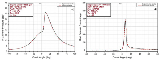 Validation of (a) in-cylinder pressure and (b) HRR.