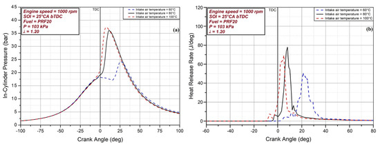 Change in (a) in-cylinder pressure and (b) HRR at various intake air temperatures.
