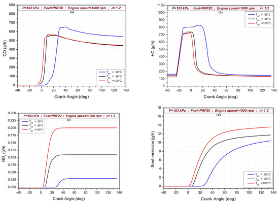 The effects of intake air temperature on (a) CO, (b) HC, (c) NOx and (d) soot emissions.