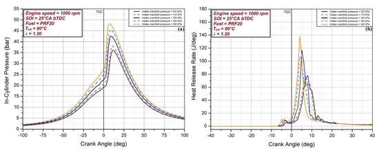 Change in (a) in-cylinder pressure and (b) HRR at various intake manifold pressures.