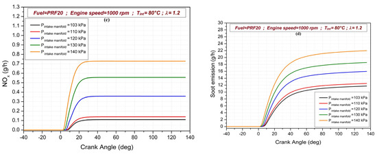 The effects of intake manifold pressure on HC, CO, NOx and soot emissions for the RCCI combustion mode are seen in Figure 7. The nOx and soot emission values increase due to the effect of rising in-cylinder temperature with increasing intake manifold pressure. The minimum value of NOx emission is recorded as 0.110 g/h at a 103 kPa intake manifold pressure. In addition, an increase in HC and CO emissions is also observed as more charge is taken into the cylinder with the increase in intake manifold pressure. The maximum values of these emissions are obtained at 140 kPa intake manifold pressure. In the analyses performed in the closed cycle, it is observed that the HC emissions are at different values before direct injection with increasing intake manifold pressure, since approximately 8% of the residual exhaust gas formation was defined after combustion in the cylinder. As the intake manifold pressure increases, it can be stated that the emissions are released at lower crank angles with increasing temperature.