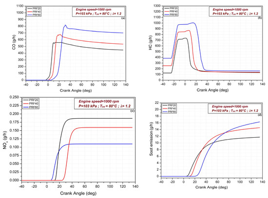 The effects of premixed ratio variation on HC, CO, NOx and soot emissions in RCCI combustion mode are shown in Figure 9. In general, it is seen that increasing the amount of iso-octane fuel in the mixture causes an increment in HC, CO and soot emissions. The minimum values of these emissions are recorded with PRF20 fuel. On the contrary, the NOx emission values decrease. It can be concluded that this is caused by the reduction in the in-cylinder temperature with the increase in the percentage of iso-octane content in the mixture. The minimum NOx emission obtained is 0.110 g/h with PRF60 fuel.