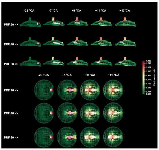 It is not possible to experimentally obtain the distribution of equivalence ratio of the fuel and the in-cylinder temperature depending on the crank angle. These parameters were also analyzed numerically. The distribution of equivalence ratio for different premixed ratios is shown in Figure 10. The distribution of the fuels at different crank angles and the regions where they are concentrated were investigated depending on the PRF ratio change. The amount of iso-octane in the fuel mixture directly affects the equivalence ratio in the cylinder. Considering the equivalence ratio distribution, the formation of richer regions can be increased by reducing the amount of n-heptane in the mixture [61], which significantly affects the combustion efficiency.
