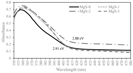 The bandgap energy shifting characteristics of MgS-TiO2 photocatalyst was investigated using ultraviolet-visible (UV-vis) spectrophotometer, and the results obtained were compared with pure TiO2, as depicted in Figure 2. The band gap energies of all samples were obtained from the Tauc plot by extrapolating a tangent line to the abscissa axis [23]. It can be observed that the absorption edge of the TiO2, MgS-1, and MgS-3 was 425 nm, with the band gap energy value calculated to be 2.91 eV. There was no noticeable shift in the spectra after the addition of MgS-1 and MgS-3, suggesting that Mg doping does not influence the band gap of TiO2. A similar finding was also observed in a previous Mg-doped TiO2 study, where the doping of Mg did not alter the band energy gap of TiO2 significantly [21]. However, for MgS-2, it was seen that the absorption edge is slightly shifted to a higher wavelength of 430 nm that resulted in lower band gap energy of 2.88 eV.