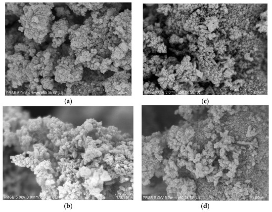 FESEM with 50 kX magnification for (a) MgS-0, (b) MgS-1, (c) MgS-2, and (d) MgS-3.