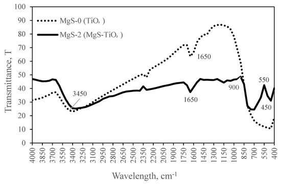 FTIR scan was measured in the range of 400 to 4000 cm−1 to confirm the presence of MgS that has been added onto TiO2. The FTIR spectra for TiO2 and MgS-TiO2 are shown in Figure 6. Both samples exhibit peaks at 1650 and 3450 cm−1, corresponding to O-H stretching and bending. An absorption band between 400 and 1000 cm−1 was attributed to Ti-O stretching vibrations, where the same absorption band correlation was found in the study by Yee et al. (2017) [20]. MgS-TiO2 showed a significant decrease in the transmittance peak compared to TiO2 within 1000–2300 cm−1 wavelength range. The FTIR spectrum of MgS-TiO2 showed strong absorption peaks around 440 and 550 cm−1 for the stretching mode of vibration of the MgS structure. This confirmed the presence of MgS in the TiO2 photocatalyst that has been synthesized. The wavelength number of the vibrational peaks for MgS-TiO2 agreed with the previous reported literature values [24].