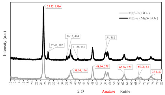 XRD patterns were recorded to determine crystalline structure and phase compositions. Figure 7 shows the XRD patterns of the MgS-0 (TiO2) and MgS-2 (MgS-TiO2) photocatalysts. The XRD pattern of MgS-0 and MgS-2 indicated increased peak intensity of the crystalline phase distribution. This crystalline structure is apparently stable and can enhance photocatalytic activities [25]. The diffractogram of MgS-2 differs from the pure MgS-0 (TiO2), and it shows band broadening with decreased peak intensity. The diffraction peaks in the XRD pattern around 2θ of 25.32°, 38.04°, 48.16°, 62.76°, 69.08°, and 75.1°, which can be associated with the (A101), (A004), (A105), (A204), (A116), and (A215) crystal planes of anatase-phase TiO2. The samples exhibit similar XRD curves for both samples, and all the diffraction peaks can be indexed to the TiO2 anatase powder that is being used for the synthesis. For MgS-2, the TiO2 crystals in the form of rutile were found at around 27.42° (R110), 36.12° (R200), 41.28° (R111), and 54.0° (R220) [26]. The XRD analysis of MgS-2 revealed that the anatase phase accounted for 31% of the sample, whereas the rutile phase accounted for 18%. This shows that the synthesis process of incorporating the MgS onto the TiO2 anatase based catalyst caused some of the anatase phase to change to rutile phase during the calcination process. For MgS-2, there are no characteristic diffraction peaks of MgS, probably owing to its low content and high dispersity. Simultaneously, the XRD peak position of TiO2-loaded MgS shows small changes to some extent, suggesting that MgS ions did not incorporate into the TiO2 lattice and only loaded on the surface of TiO2. X-ray spectroscopy is a very useful technique to analyze the surface nature and composition of solids, and, in the present work, this would confirm that MgS is mainly on the surface of TiO2, without being incorporated into the TiO2 lattice.