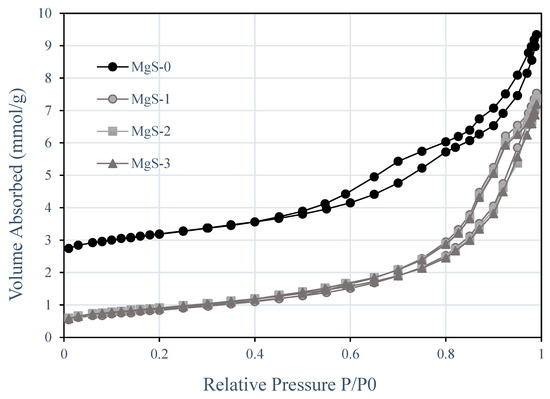 N2 adsorption–desorption isotherm for MgS-0, MgS-1, MgS-2, and MgS-3.