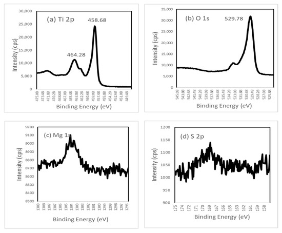 To investigate the changes in the chemical environment, XPS measurements were performed on the prepared MgS-TiO2 photocatalysts. The XPS spectra of all catalysts were shown in Figure 9. Figure 9a shows two peaks at 458.68 and 464.38 eV for the Ti spectrum, which were assigned to Ti 2p3/2 and Ti 2p1/2 of Ti4+. Figure 9b shows the spectrum of O 1s of TiO2, where the peak observed at 529.78 was attributed to lattice oxygen (Ti–O). The presence of the Mg 2p peak (Figure 9c) and the S 2p (Figure 9d) peak indicates the successful doping of MgS onto TiO2.