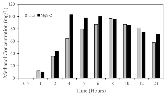 For the photocatalytic conversion of CO2 to methanol experiment, TiO2 anatase was tested against MgS-TiO2 at 0.5 wt % (MgS-2). The experiment was conducted continuously for 24 h to determine the photocatalytic activity, as shown in Figure 11. The highest methanol concentration was achieved after 4 h for MgS-2, but TiO2 achieved the highest methanol concentration after 6 h. The methanol concentration started to decrease for both TiO2 and MgS-2 after 8 h. As methanol is a volatile substance, after a long period of time in the reactor, the methanol vaporized into the gas phase, and the liquid phase will have a decrease in the methanol concentration. Xu et al.’s (2017) study showed that the formation of Ti3+ in Mg-doped TiO2 samples could be responsible for their higher activities in comparison with native TiO2, since Ti3+ can help delay the recombination of the e−−h+ pair. The combination effect of lattice distortion and defects with Ti3+ was found to increase the photocatalytic activity nearly three times [31]. Selvaratnam and Koodali (2018) stated that the Mg doping on TiO2 also alters the acid–base properties and enhances the more basic character in TiO2 [32]. Therefore, the properties favor better adsorption of CO2 at the surface of MgS-TiO2 that resulted in higher methanol yield.