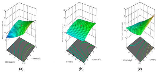 Interaction of two parameters on CO2 photoreduction: (a) catalyst loading–temperature, (b) time–temperature, (c) catalyst loading–time.