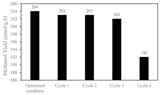 Reusability of catalysts is essential for developing heterogeneous catalysts. To evaluate the recyclability of the photocatalyst for the reduction of CO2 to methanol, a recycling test was performed. The photocatalyst was easily separated by centrifugation of the reaction mixture, and the methanol yields were measured for four cycles. It was observed that the catalyst maintained the same methanol yields after three cycles, but in the 4th catalytic experiment, the recycled catalyst showed a 5% drop in methanol production. The photocatalytic conversion experiment (Figure 13) revealed that, after 8 h, the active sites became active, and only a few sites became active after recycling; thus, the main sites remain deactivated. Therefore, it can be concluded that the photocatalyst can be recycled for four cycles. The deficiency of the catalyst can be addressed by adding fresh catalyst to the reaction.