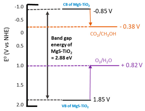 Figure 14 displayed the valance band (VB) of MgS-TiO2 (+1.85 V), which was more positive than the water splitting oxidation potential (+0.82 V), and the conduction band (CB) of MgS-TiO2 (−0.85 V) was more negative than the CO2/CH3OH reduction potential (−0.38 V). These band structures resulted in the suitability of MgS-TiO2 to catalyse the photocatalytic reaction that leads to the conversion of CO2 into methanol.