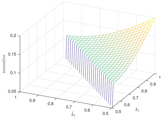 Corollary 6 gives the optimal incentive that the government should provide when employing a single agent while ensuring a certain level of power generation, W. Comparing Proposition 1 and Corollary 6, we notice that when power generation is the priority task, improvements in both power generation and carbon reduction efficiency can increase incentives, but the impact of the two on incentives is not the same. Specifically, in Proposition 1, both power production and carbon reduction efficiency can promote incentive increases, with their effects on incentives being symmetric. However, in Corollary 6, the two efficiencies do not have a symmetrical impact on incentive increases. A closer look at Figure 8 reveals that the effect of carbon reduction efficiency on incentives is more significant. This phenomenon is largely due to the background of ensuring power supply; improving power generation efficiency effectively eases the burden of completing the power supply task. As shown in Equation (15), an increase in the production efficiency parameter leads to a decrease in the production effort , assuming other conditions remain constant. Therefore, the impact of improving production efficiency on incentives is less pronounced when compared to the impact of improving carbon reduction efficiency.