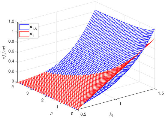 In terms of the absolute level of effort, without additional parameter conditions, it is challenging to determine which of the two agency models is superior in stimulating effort. For instance, when approaches 0, in the first management mode, the incentive factor is greater than and . However, under the first management mode, as a single agent A is handling both tasks, A must take into account the net efficiency of effort, and the effort reaction function is . When two agents are responsible for two tasks respectively, each agent only considers the impact of their own efficiency on the output of the department they are responsible for, without considering the impact of their own work on the effectiveness of other departments. In this case, the effort reaction function rises to . Due to the influence of the these two factors, a direct comparison of the effects of the two systems on optimal effort is not straightforward. To illustrate this, consider Figure 4, which presents the relationship between production effort and electricity generation efficiency under two management systems. It can be observed that when approaches 0, although is greater than , the agent’s effort in electricity production may not necessarily satisfy . In particular, when the value of is not sufficiently high, .