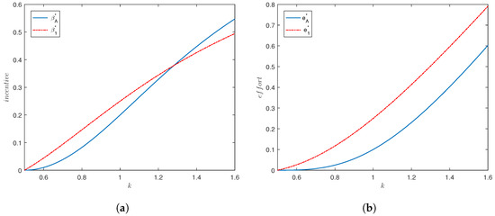 The critical threshold is related to various factors. When the production efficiency k increases, decreases while increases. This means that enhancing production efficiency reduces the incentives in the multi-agent system as compared to those in the single-agent system, thereby promoting the division of labor. Please refer to Figure 5a for a visual representation of this conclusion. In practical scenarios, conflicts not only exist between power production and carbon reduction tasks in thermal power stations, but also between new project development and risk control in enterprises, as well as conflicts between household chores and work in daily life. Given scarce resources and time, conflicts are unavoidable. This proposition suggests that as efficiency improves, the division becomes an inevitable aspect in terms of reducing contractual incentives.