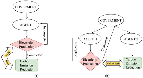 As illustrated in Figure 1b, in this case, the government employs two agents, each responsible for either electricity production or carbon reduction. We assume that in a thermal power generation enterprise, agent 1 takes responsibility for electricity production, and agent 2 shoulders the environmental task of carbon reduction. Under a linear incentive system, their respective payoff functions are