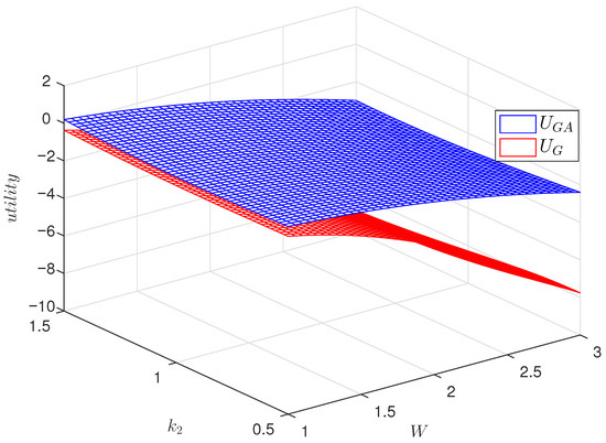 By substituting into Equation (22), we obtain the optimal revenue function for the government. Additionally, it is clear that and are both the downward-opening quadratic functions with respect to the output W. Therefore, unbridled increment in electricity demand will result in a decrease in government revenue, regardless of the number of agents tasked with the workload. However, to ensure the public welfare, the government may willingly absorb these losses, which is beyond the scope of this paper. The impact of an increased W on government revenue is depicted in Figure 9.