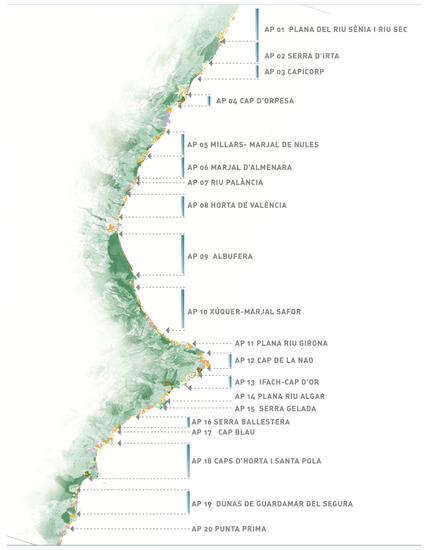 - Consellería de Vivienda, Obras Públicas y Vertebración del Territorio. Plan de Acción Territorial de la Infraestructura Verde del Litoral. 2018. Available online: http://www.habitatge.gva.es/es/web/planificacion-territorial-e-infraestructura-verde/plan-de-accion-territorial-de-la-infraestructura-verde-del-litoral (accessed on 15 May 2023).