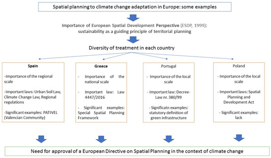 In Europe, the approval of the European Spatial Development Perspective (ESDP) in 1999 [42] established a notable change in the objectives and procedures of territorial planning. First, sustainability became the guiding principle of spatial planning actions. On the other hand, the treatment of spaces to be protected due to their environmental, patrimonial, or cultural value came to occupy a prominent place in the procedure for assigning new land uses, especially at the local urban scale. The application of ESDP principles in different territorial agendas [43,44] makes it possible to have a roadmap in terms of the spatial planning that European countries must strive to achieve. However, the drive to meet these objectives and actions differs depending on the country or region that develops such planning. One last step in the commitment to sustainability as the main objective of spatial planning has been the establishment, with various instruments, of compliance with the Paris Agreement in the territory of the Union (European Climate Law [45], European Green Deal [46], 2030 Climate and energy framework [47], and 2050 Long-term strategy [48]) that has important territorial effects (energy, mobility, territorial planning). In addition, the regulations and adaptation plans for climate change in different countries contain determinations for including the climate change perspective in the territorial planning process. In individual countries, the content of spatial plans can be considerably broader. There are usually different types of spatial plans, and the elements mentioned above may be included in different types of plans. However, in the literature, the role of spatial plans is sometimes viewed much more broadly. Plans can contain provisions related to diverse spatial aspects and influences, such as the equitable distribution of benefits in cities, the protection of the environment, the shaping of ecosystem services, and even the reduction in social inequalities [39]. It is, therefore, clear that spatial plans should also provide answers to the challenges of climate change adaptation [49]. An important issue (which also has a significant practical dimension) is the identification of optimal spatial planning approaches to the challenges of climate change adaptation, considering good practices and the risks involved.