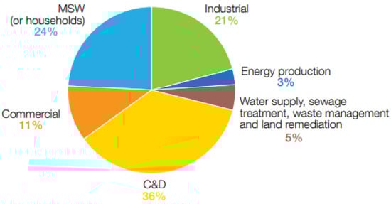 As depicted in Figure 2, the three major contributors of waste are construction and demolition, accounting for 36% of total waste; industrial and commercial waste, accounting for 32% of total waste; and MSW, accounting for 24% of total waste in OECD countries.