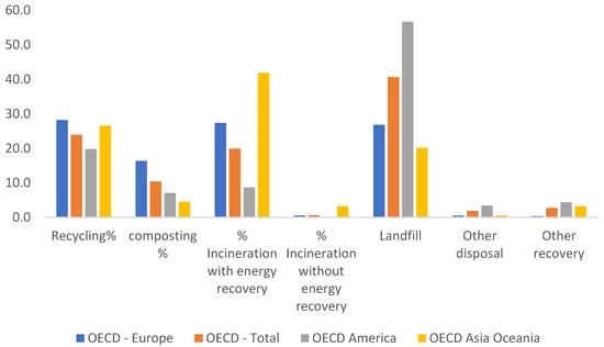 There are several ways to deal with waste in general and plastic waste in particular. Each country has a distinct split of waste management. The OECD [23] has reported data regarding waste management techniques for all participating countries. Waste management techniques were categorized as recycling, composting, incineration with energy recovery, incineration without energy recovery, landfill, other disposal, and other recovery. Figure 4 shows percentage statistics gathered for Europe, America, Asia Oceania, and total OECD for the year of 2020 [23].